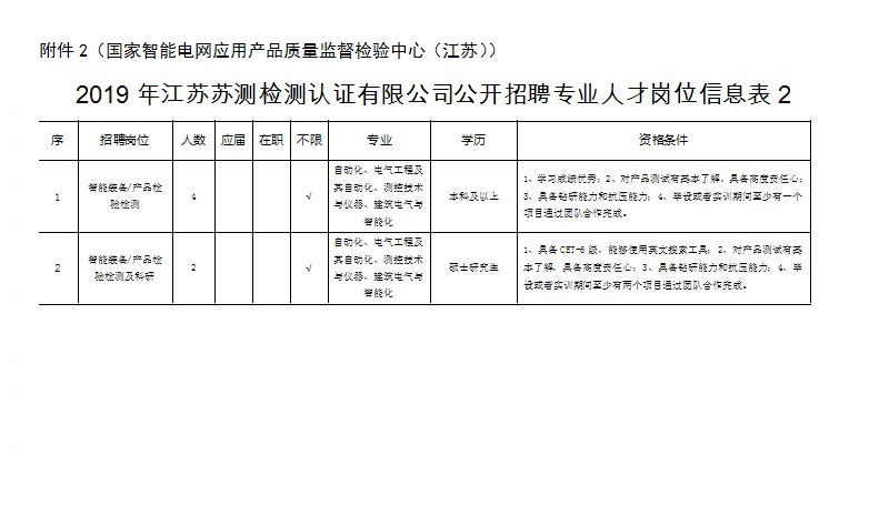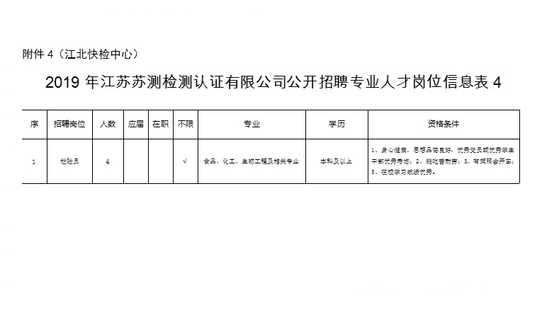 4.具備崗位資格條件(詳見附件:《2019年江蘇蘇測檢測認(rèn)證有限公司公開招聘專業(yè)人才崗位信息表》)